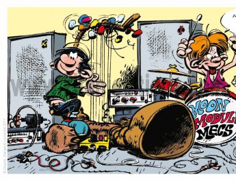 Nous y retrouvons Jules de Chez Smith en Face, Bertrand Labévue et Gaston Lagaffe lors d'une répétition des ''Moon Module Mecs'' testant (entre autres) le gaphophone électique.